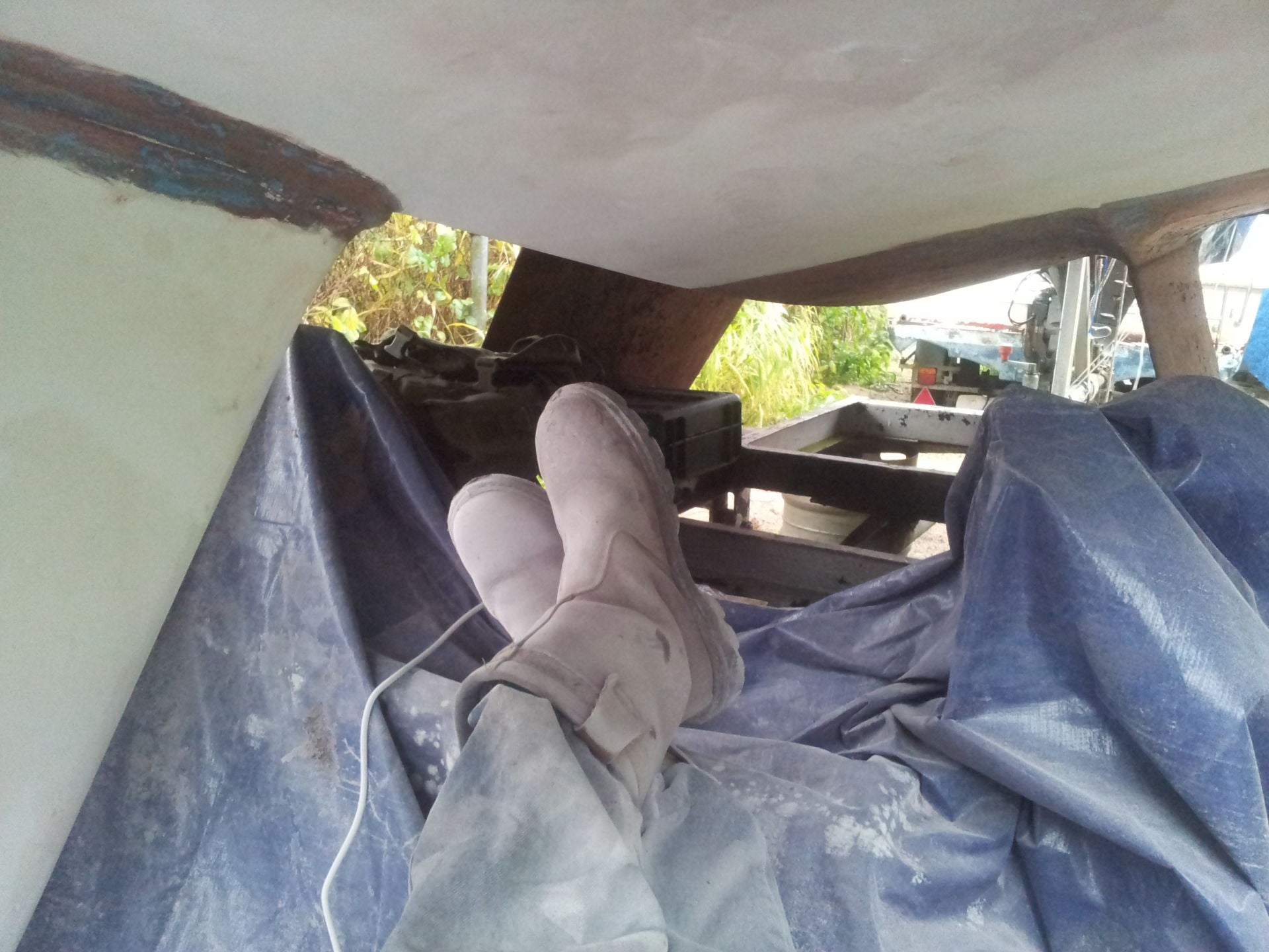 Het onderwaterschip was alles behalve strak en glad, dit kwam voornamelijk door de 1000 verschillende lagen antifouling. Na in totaal 30 uur schuren met de excentrische schuurmachine (korrel 40) was het onderwaterschip kaal. Onder de dikke laag antifouling bleek, op een paar plekjes na, het laminaat in goede staat.